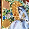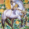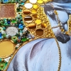 The realistic image of the horse seems to emerge through a kaleidoscope of semi-precious stones.