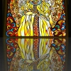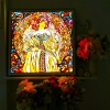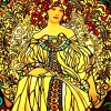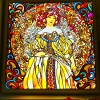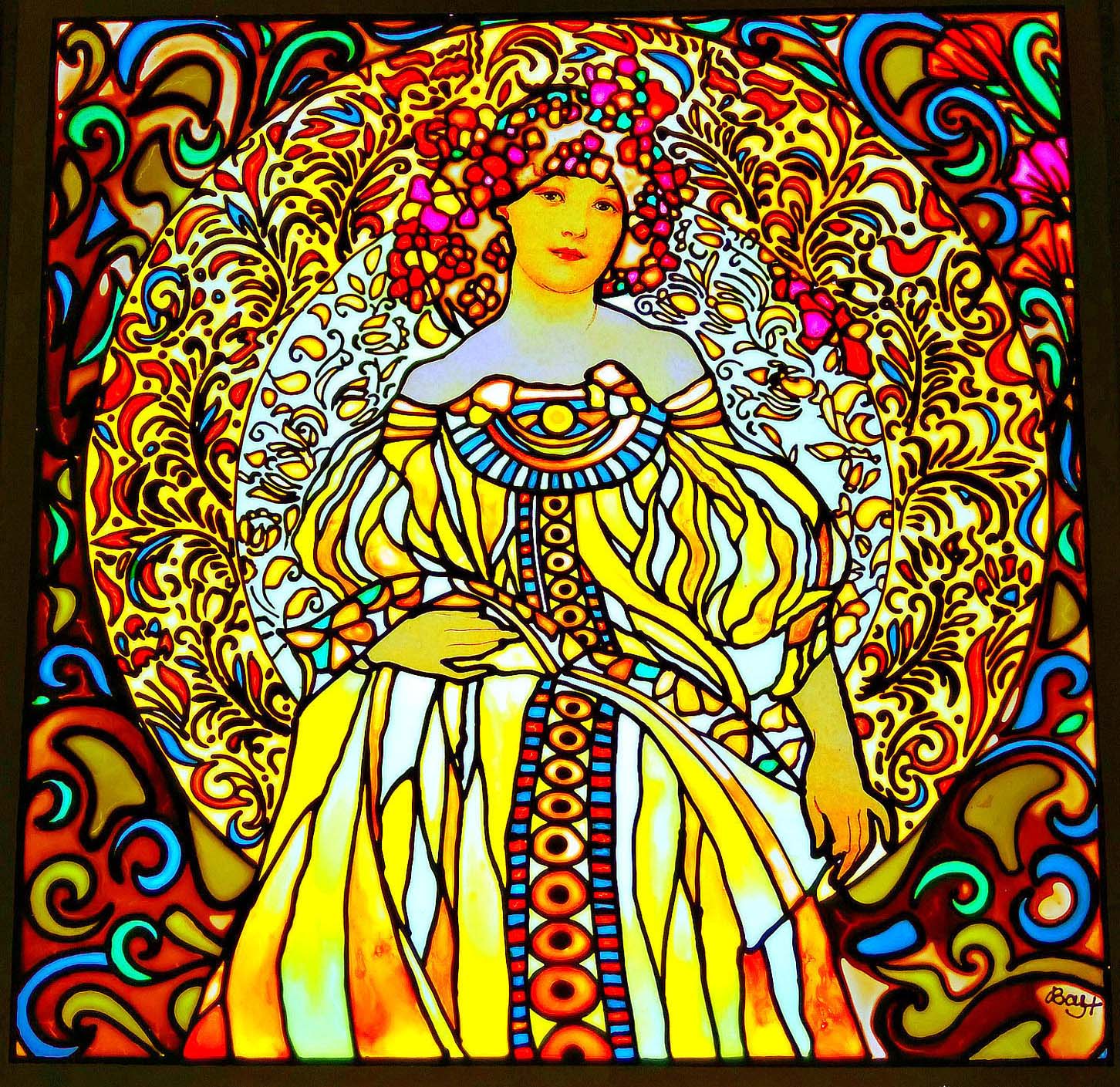 A beautiful, vibrant stained glass decorative panel in the Art Nouveau and Baranow Art Gallery styles, inspired by a painting by Alphonse Mucha.