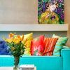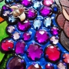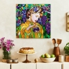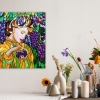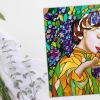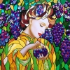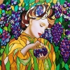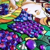 A stunning Tiffany-style painting on stretched canvas. "Ginger woman and grapes" embodies an enchanting atmosphere and vintage sophistication. The indescribable sparkle of large, iridescent rhinestones in shades of violet, lilac, fuchsia, orchid, plum, and lavender creates the effect of a true stained-glass window. Elegant bees with small rhinestones complement the composition, lending it a special charm, lightness, and vibrant movement.