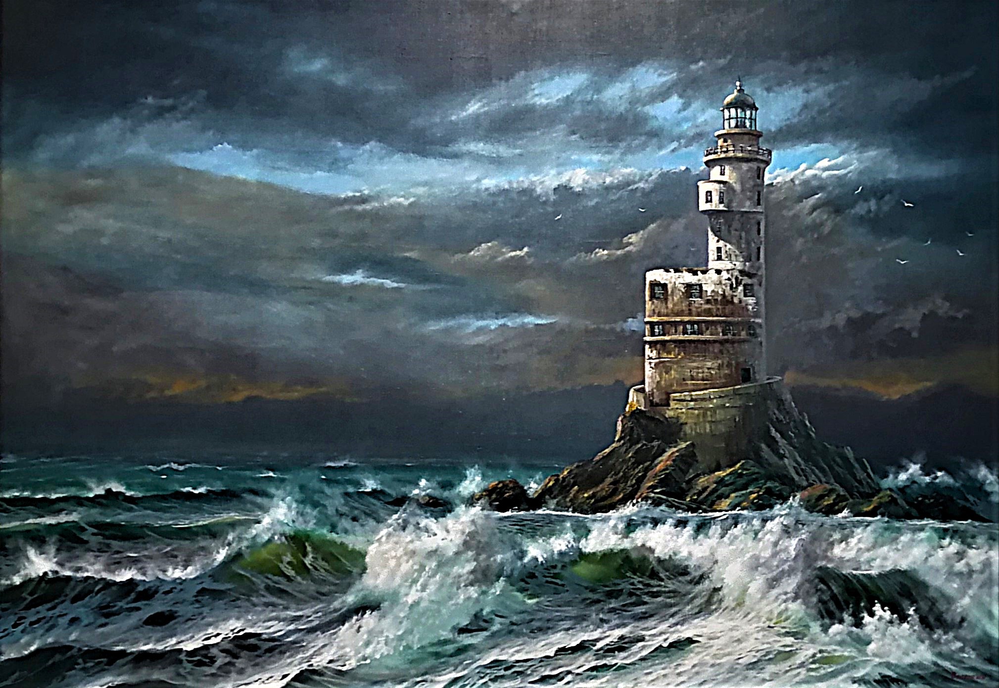 "Lighthouse Cape Aniva" is a dramatic and mysterious painting that immerses the viewer in an atmosphere of the power of nature and the resilience of the human spirit. The canvas depicts a cliff with a lighthouse, surrounded by a stormy sea. Menacing waves with white foam crash against the rocks, emphasizing the power of the elements and their intransigence.