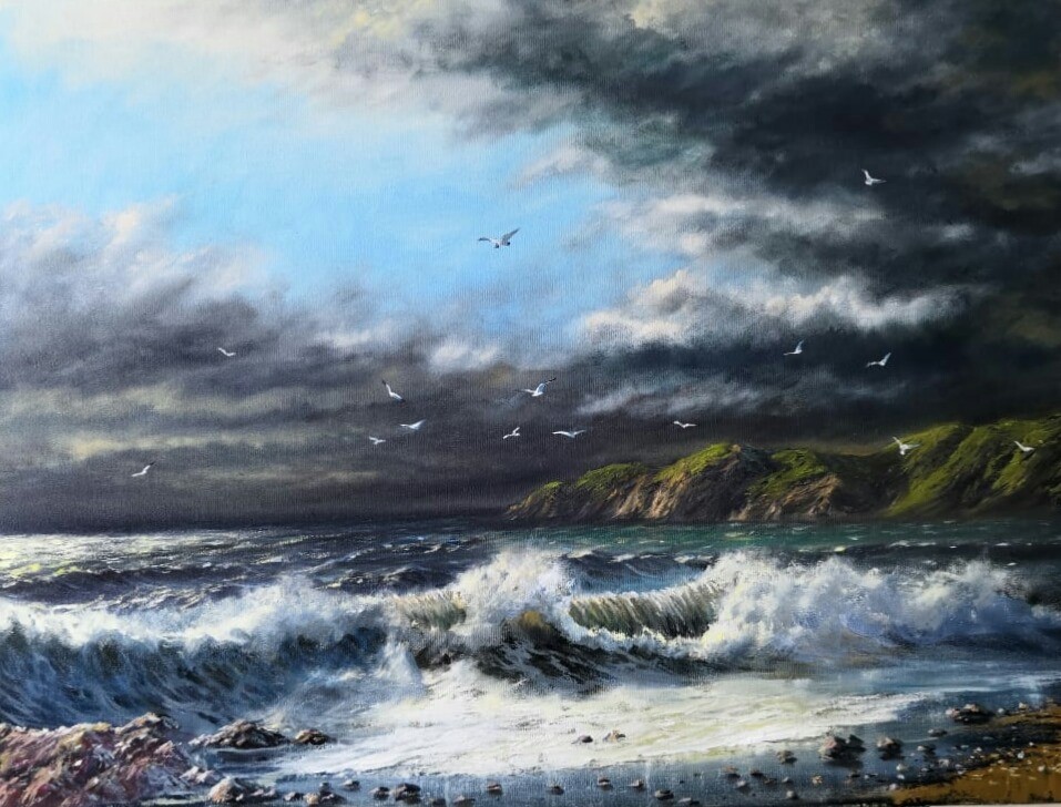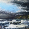 The painting "Eye of the Hurricane" captures the raw power and untamed beauty of nature during a tempest. The stormy sky, filled with dark, turbulent clouds, dominates the composition, creating a sense of drama and tension. Waves crash aggressively against the rocky shore, their foamy crests illuminated by fleeting rays of light breaking through the ominous clouds.