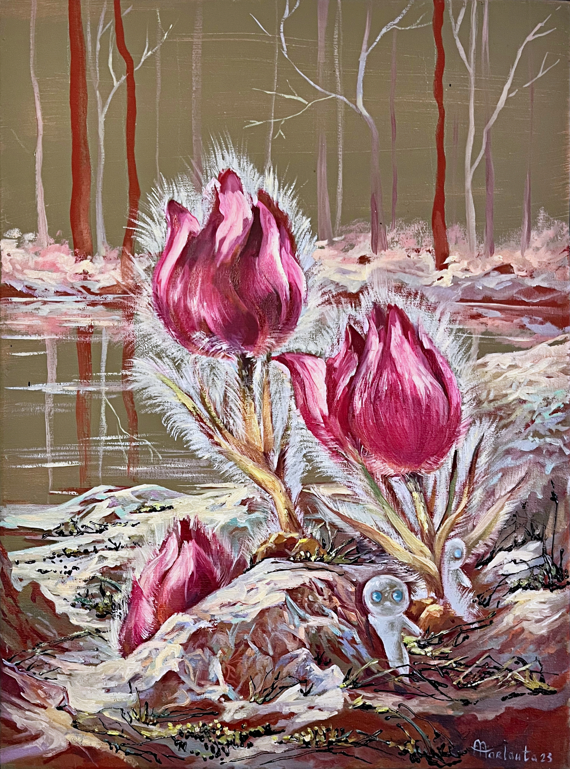 This painting captures the very first whispers of spring in a secluded corner of the Karelian forest. Here, among snow-dusted moss and ancient rocks, the crimson Pasque Flower (or Dream Herb) raises its fiery blooms towards the sun. Its petals are as soft and downy as the flank of a sleeping deer.