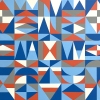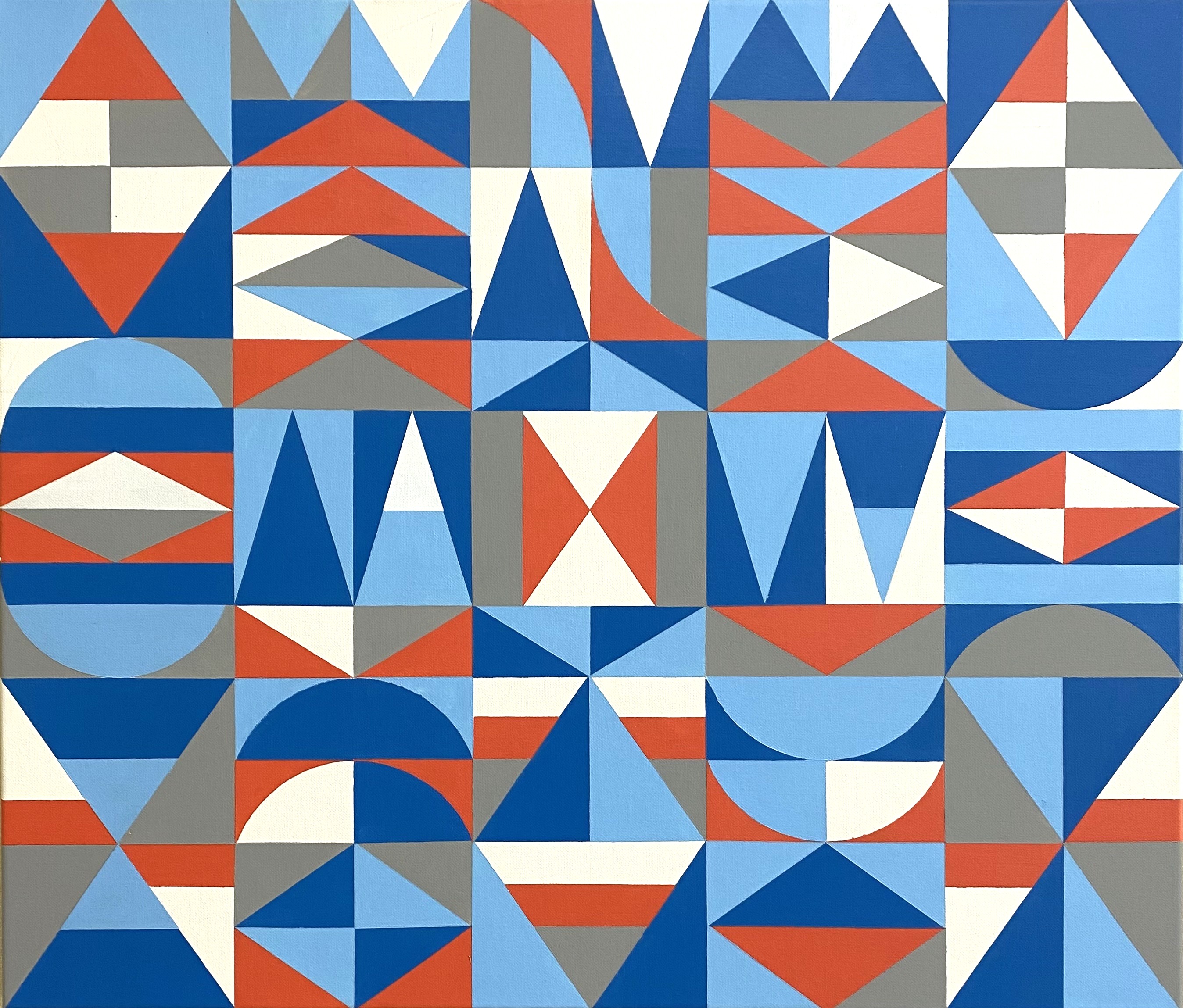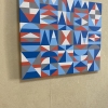 This artwork is a vivid example of geometric abstraction, representing a carefully curated mosaic of forms. The predominant palette of blue, red, white, and gray creates a dynamic visual balance. Alternating colors and precise symmetry evoke a sense of rhythm and movement, inviting the viewer to explore each section individually. The bold use of contrasting colors enhances depth and volume, while the repetition of geometric shapes forms a unified pattern on the canvas. This piece stands out for its ability to transform basic shapes into a harmonious and captivating visual symphony, showcasing the artist's skill in creating unity through diversity.