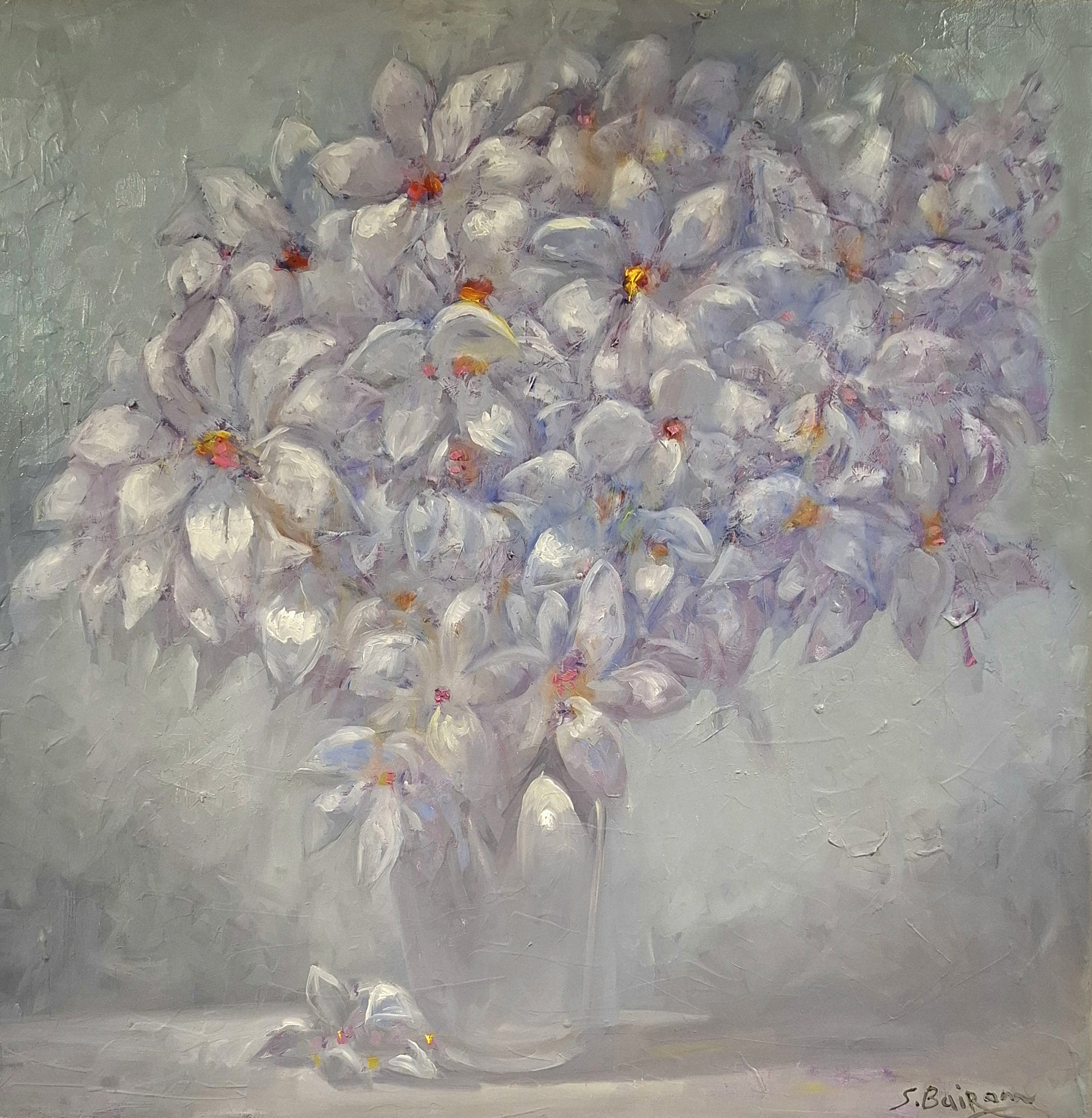 The painting "Delicate Bouquet" captures the essence of grace and subtle elegance. A lush arrangement of soft, pale flowers, painted in ethereal shades of white, lavender, and hints of pink, is depicted in a simple glass vase. The delicate blossoms seem to bloom effortlessly, radiating a quiet beauty and serenity.