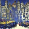 A vibrant street stretches through the heart of the painting, bustling with a crowd of people carrying umbrellas, suggesting a gentle rain. The warm light radiating from shop windows, streetlamps, and the tram in the distance creates a beautiful contrast to the deep blue tones of the evening sky.