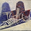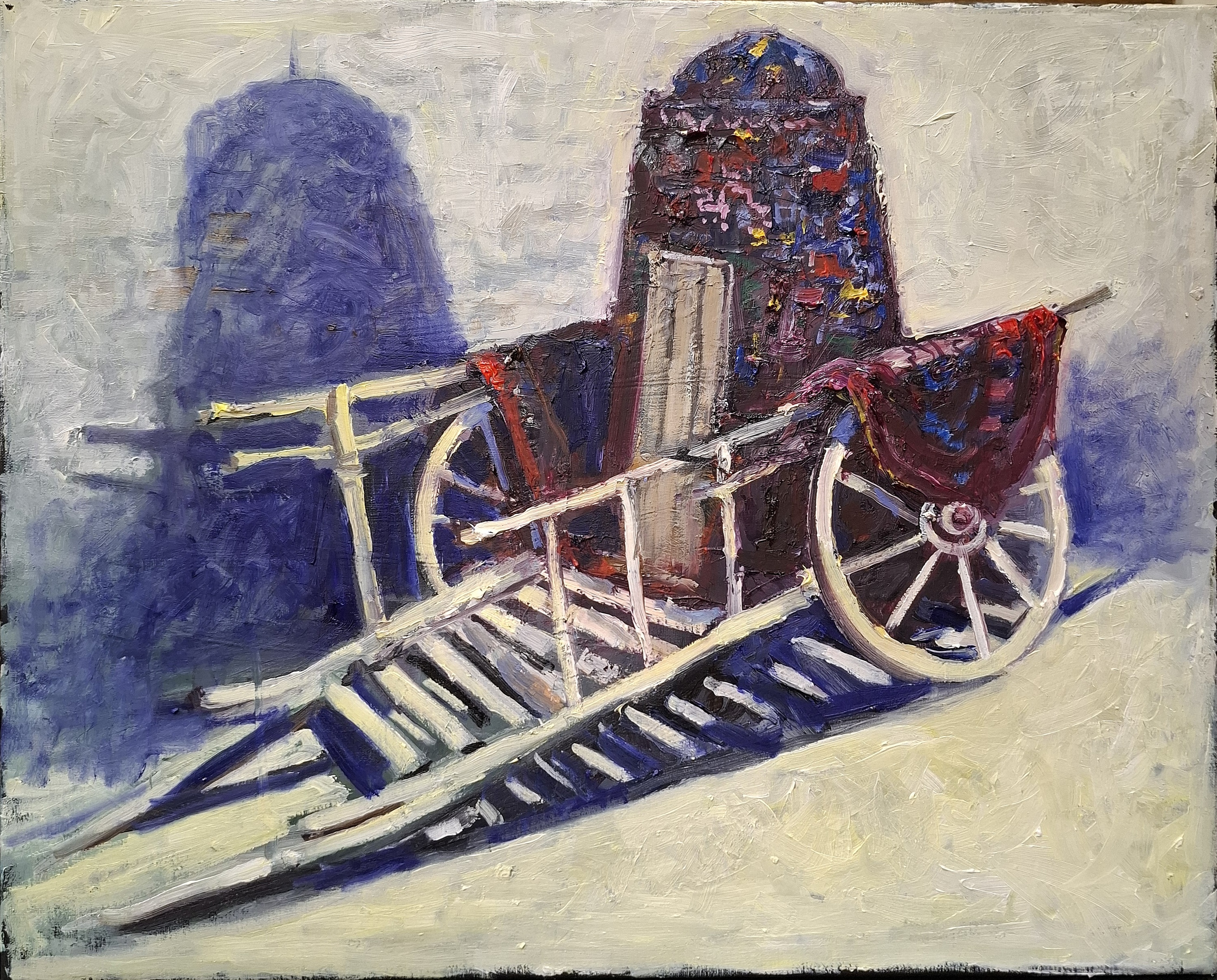 The painting "East" portrays a nostalgic glimpse into traditional Eastern culture, centered around a vividly detailed wooden cart. The composition highlights the cart as a symbol of heritage, with its intricate craftsmanship and vibrant textiles adorning its structure. The bold red fabric, embroidered or patterned, adds warmth and character to the scene.