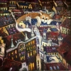 The painting "Cat" enchants with its whimsical and fairytale-like atmosphere. At the center of the composition, a gigantic, fluffy cat peacefully rests among the rooftops of a charming, fantasy-style city. The cat’s serene expression and soft, playful posture give the impression of a magical guardian watching over the town.