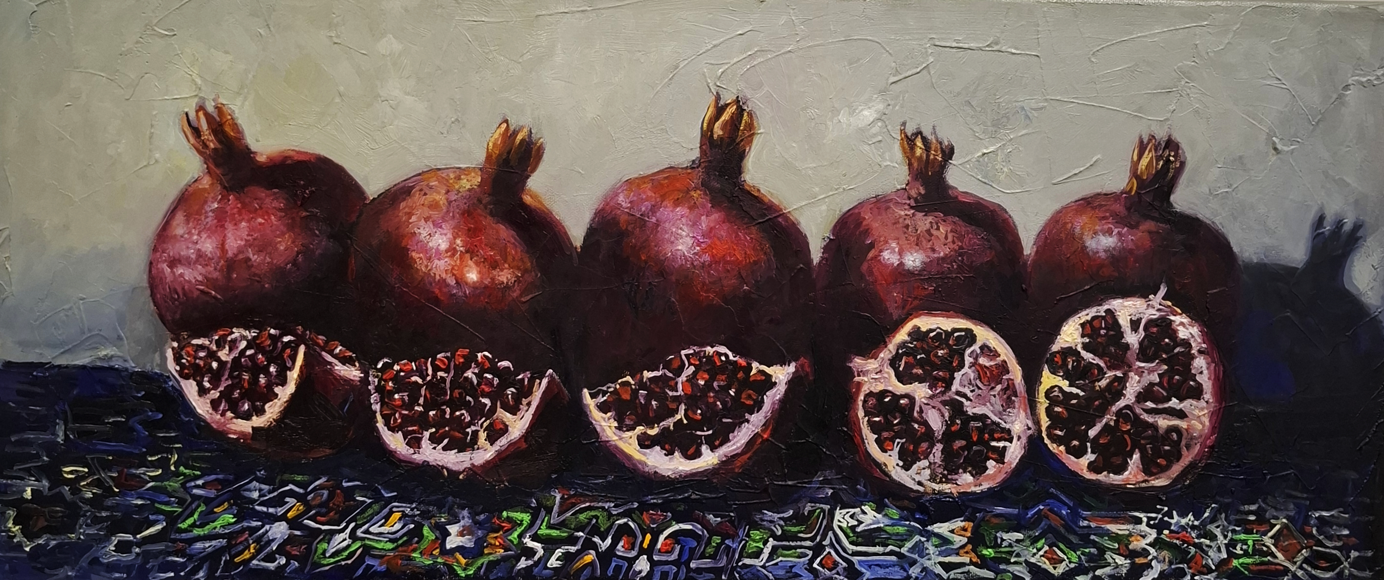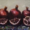 The painting "Grenades" is a vibrant and detailed still life that celebrates the rich colors and textures of pomegranates. The composition features an elegant arrangement of ripe, deep carmine pomegranates, some whole and others cut open to reveal their luscious, ruby-red seeds glistening under soft light.