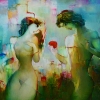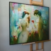 The artist's depiction of his own vision of the biblical images of the first humans, Adam and Eve, dwelling in the Garden of Eden, shows Eve handing Adam an apple; this moment marks the beginning of their life story as the ancestors of humanity.
