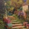 The painting transports the viewer to a cozy corner of an ancient garden, enveloped in an atmosphere of peace and solitude. A stone staircase, overgrown with moss and flowers, leads upward, beyond the horizon of the canvas, inviting the imagination to explore the hidden corners of this picturesque place. Warm shades of ochre and terracotta emphasize the warmth of the sunlight breaking through the dense foliage of the trees.