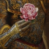 The painting depicts an elegant scene filled with contrasts: a warrior clad in richly decorated knightly armor holds a fragile flower – a delicate peony – in his metal glove. The luxurious armor is covered with complex engravings with patterns and mythological figures, which emphasizes the high status of the owner. The golden and bronze shades of the armor create a sense of grandeur and strength, while the softness of the pink peony symbolizes fragility, sensuality and humanity. The painting conveys the idea of the duality of human nature – a combination of military courage and inner vulnerability, strength and tenderness.