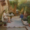 The painting transports the viewer to a cozy sunny courtyard surrounded by stone walls and greenery. In the center of the composition is an elegant young woman in a white dress and red shoes, sitting at a small table. She is immersed in reading, and next to her is a mug of a drink, creating an atmosphere of calm relaxation.