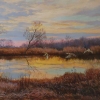 The painting depicts an autumn landscape with a quiet pond reflecting the gentle shades of the sunset sky. The water, like a mirror, reflects the soft light of the setting sun, painting the surface with warm golden and pink hues. Bushes and dry grass spread along the banks, and the bare branches of the trees create graceful silhouettes against the sky.