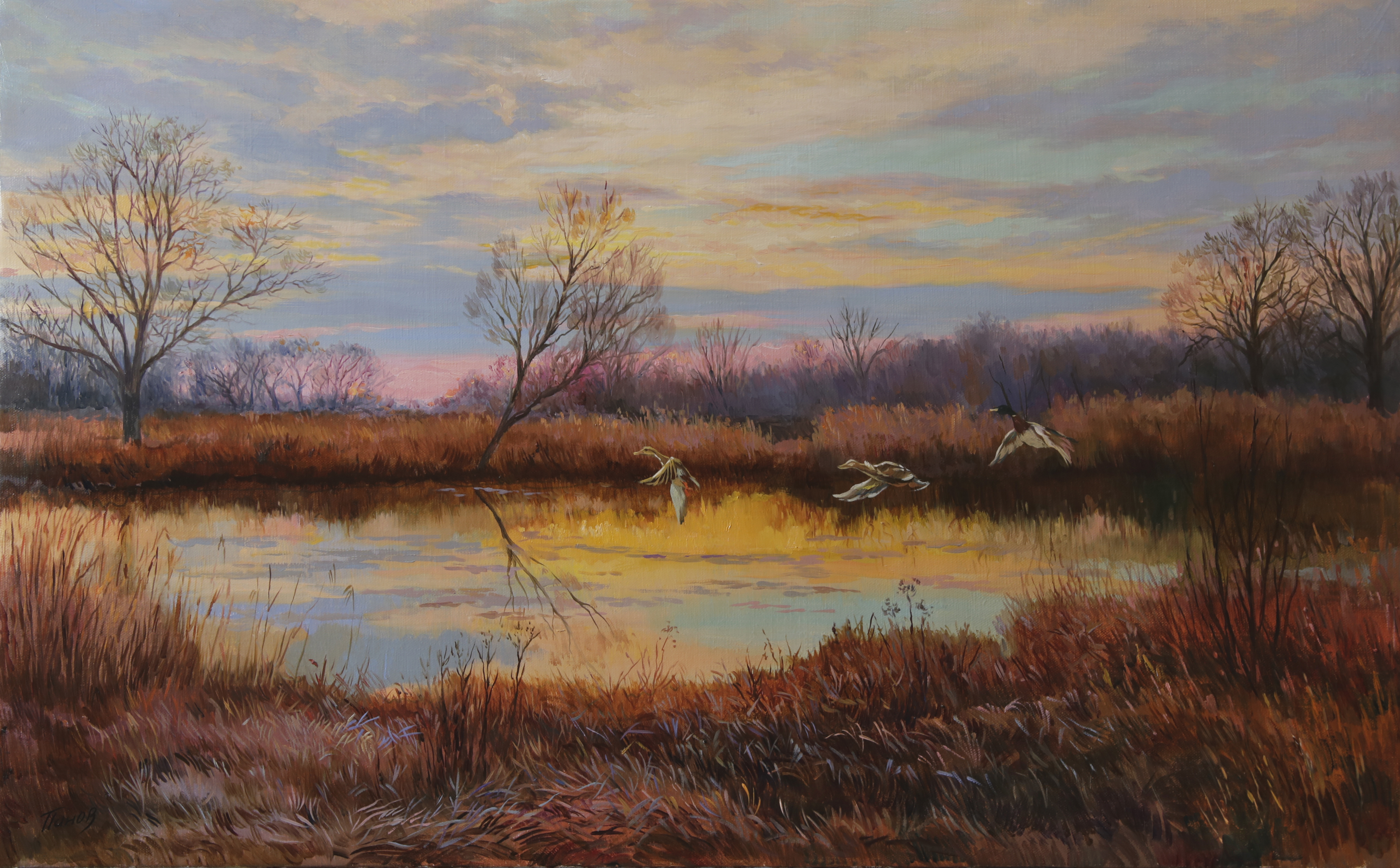 In this oil painting, I've embraced the vitality of nature, capturing its transient beauty at dusk. The delicate dance of light mirrors the graceful flight of ducks over a serene lake, inviting the viewer into a moment of peaceful reflection. This artwork exudes a warmth that can enliven any space, offering a window to the soulful embrace of the natural world.
