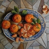 Tangerines on a blue plate, still life combines the tradition of painting by old masters, and modern decorativeness