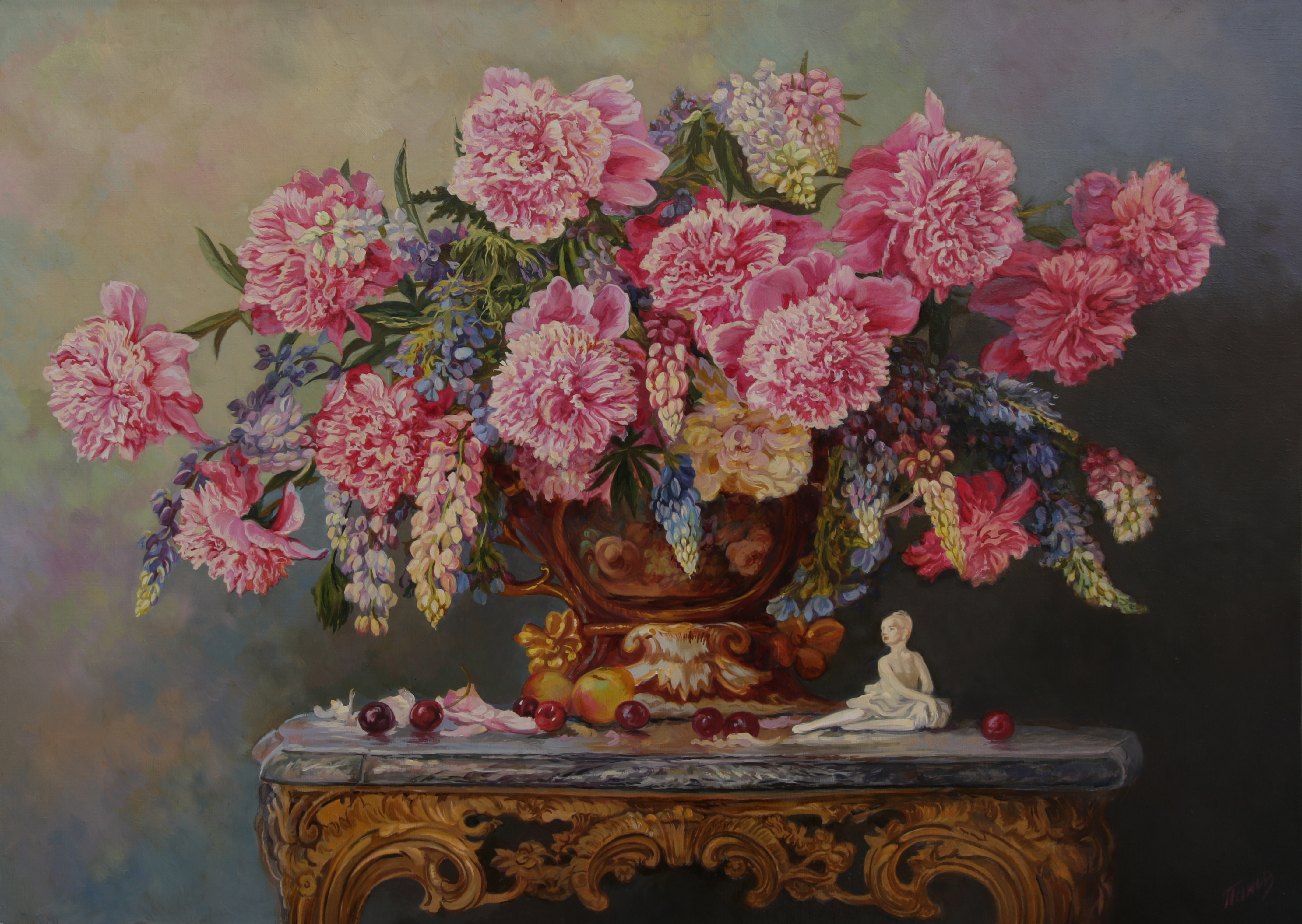 Эта оригинальная работа «Peonies on a marble table» была создана современным российским художником Эдуардом Пановым и доступна для покупки в интернете.