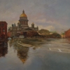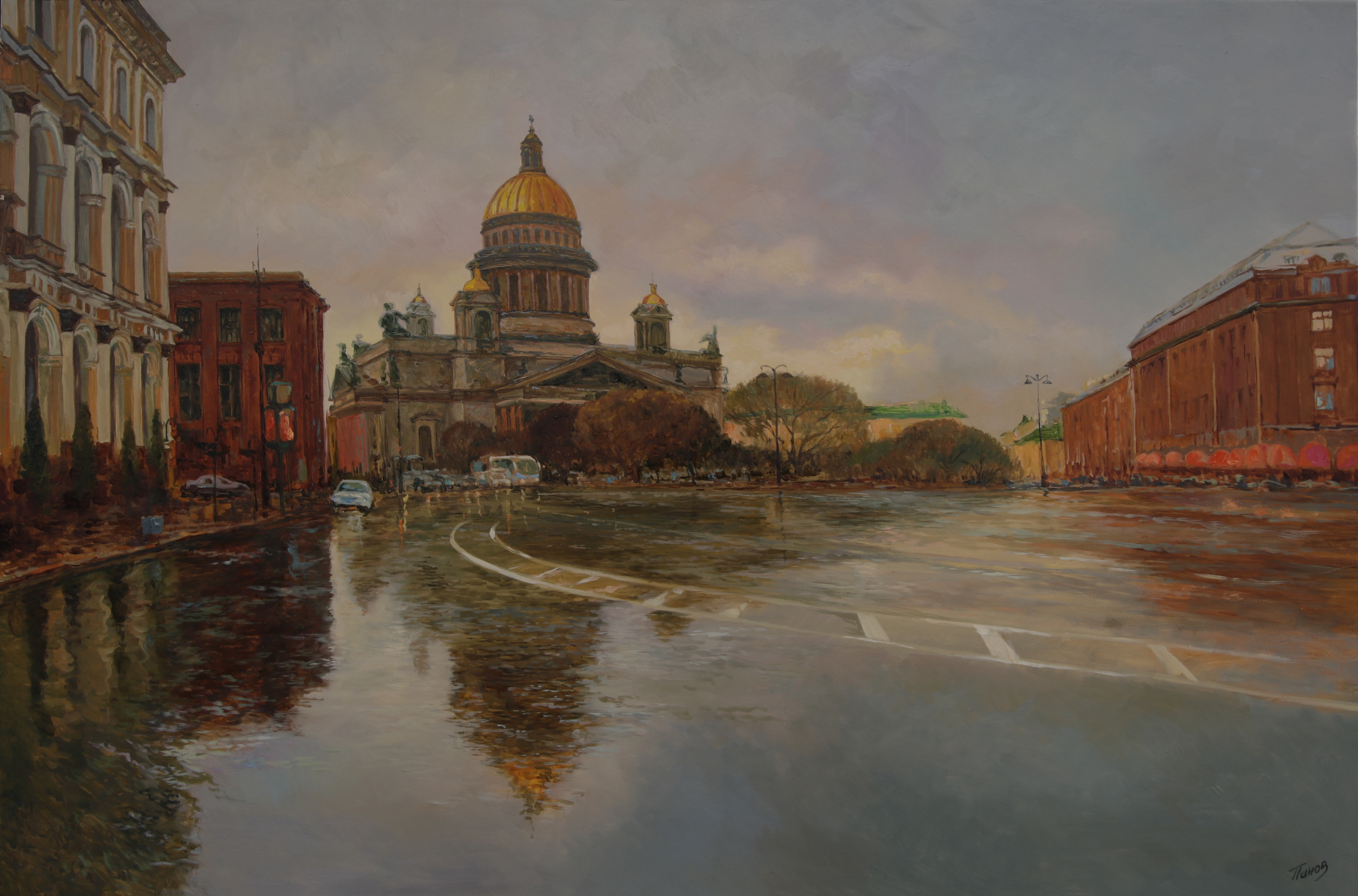 На картине Эдуарда Панова «Исаакиевская площадь в Санкт-Петербурге» запечатлен один из самых знаменитых городских ансамблей в моменты переменчивой погоды, характерной для Северной столицы. Художник передает атмосферу влажного, но величественного города.