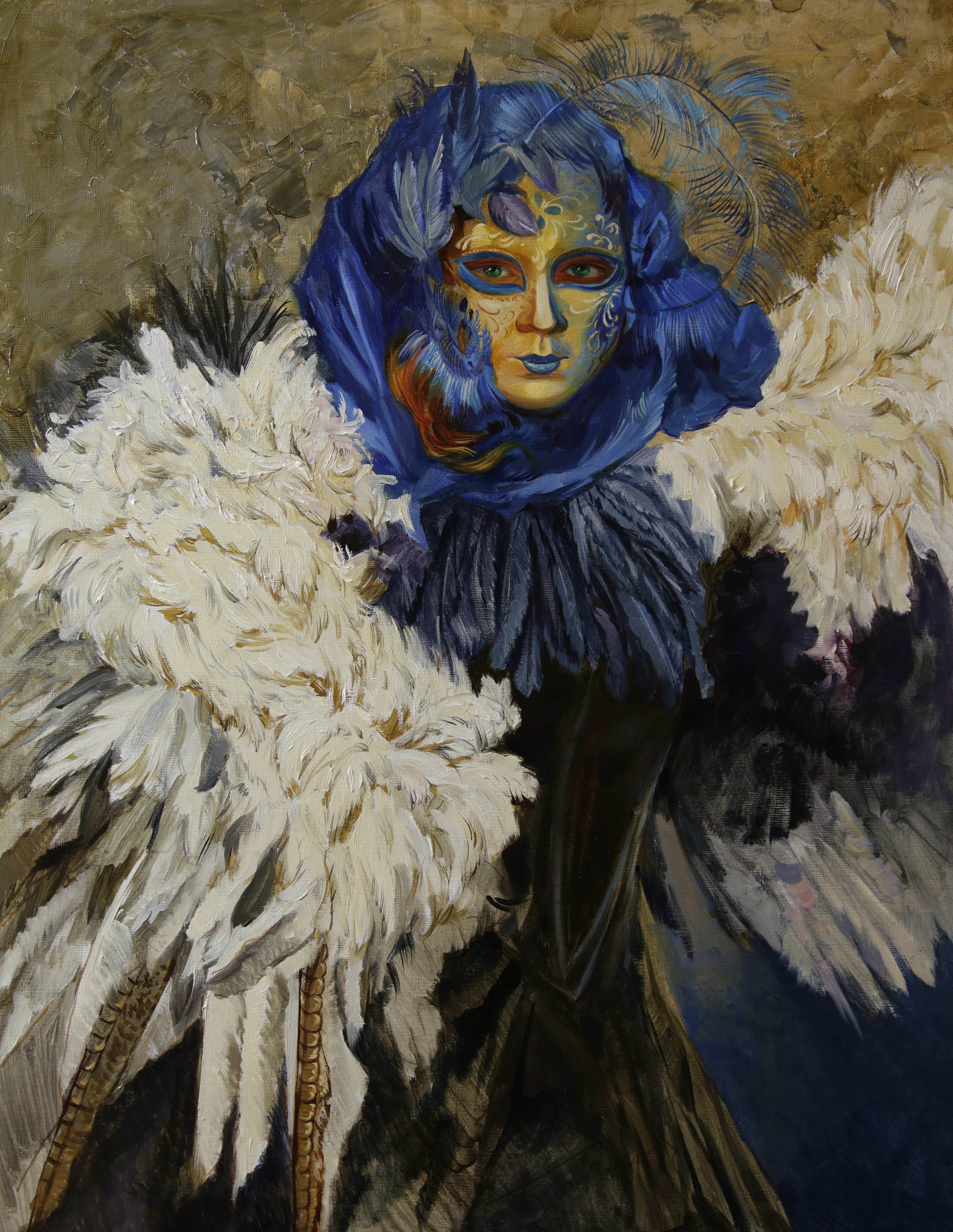 Фон картины сдержанный, выполнен в землистых и серо-коричневых тонах с лёгким золотистым отливом, что позволяет полностью сосредоточиться на сложной фактуре костюма и выразительности маски.